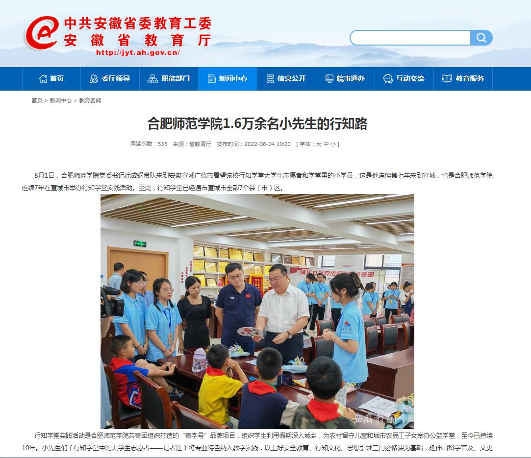 8月4日,安徽教育网首页教育要闻栏目以《合肥师范学院1.6万余名小先生的行知路》为标题,对此进行了报道。(院团委)