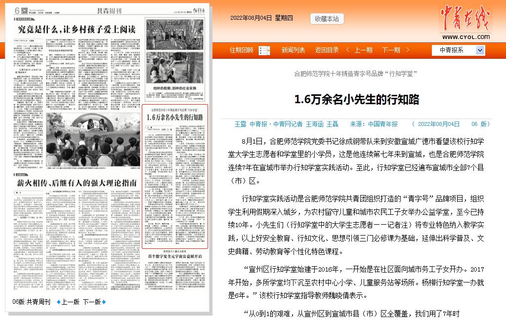 本网讯 8月4日,《中国青年报》(06版)以《合肥师范学院十年铸造青字号品牌“行知学堂”:1.6万余名小先生的行知路》为题,报道了我院“行知学堂”实践活动十周年历程。报道介绍了学院连续7年在宣城市举办行知学堂实践活动经历,以及十年来“行知学堂”实践活动中涌现出的基地学堂、特色课程、典型人物等事迹。