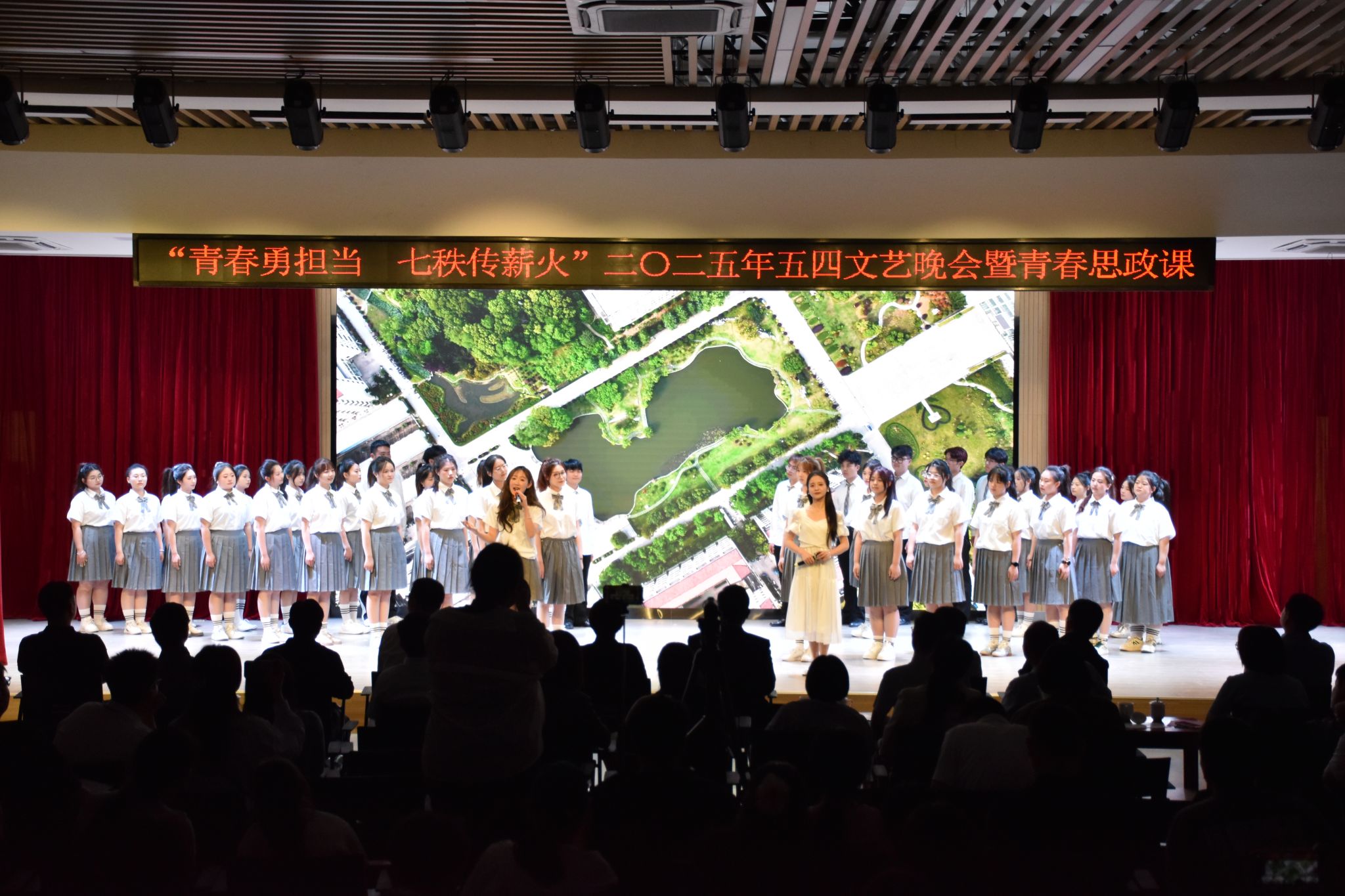 为学习贯彻习近平总书记今年五四前夕在《求是》杂志发表的重要讲话和给谢依特小学戍边支教西部计划志愿者服务队队员重要回信精神,弘扬五四精神,表彰激励先进,5月7日晚,“青春勇担当 七秩传薪火”2025年五四文艺晚会暨青春思政课在锦绣校区大学生活动中心举行。院党委书记徐成钢,院党委副书记、院长方东玲,院党委副书记梁立昌,院党委委员、副院长周端明,省青少年发展基金会副秘书长李耀红,院党委委员、组织部部长赵帮恚,院党委委员、宣传部部长、统战部部长常树宝,省青少年发展基金会体科文卫部副部长朱瑞出席晚会。学校相关部门负责人、二级学院党委书记、团委书记、辅导员及学生代表400余人参加活动。晚会通过“合师青年”抖音官方号直播。